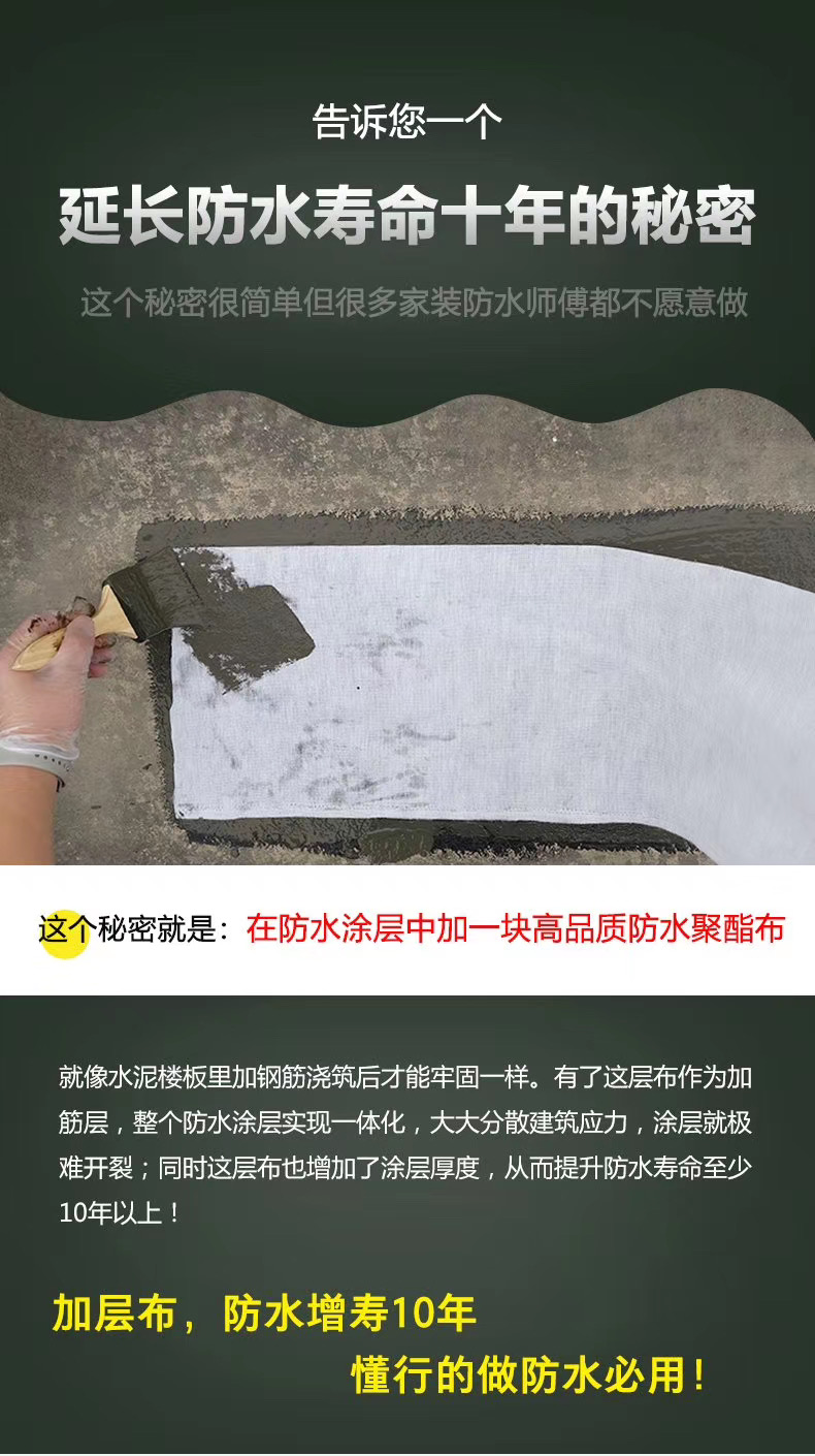 在防水涂層中加一層高品質縫織聚酯布就像水泥樓板里加鋼筋澆筑后才能牢固一樣。有了這層聚酯布作為加筋層,整個防水涂層實現一體化,大大分散建筑應力,涂層就極難開裂;同時這層聚酯布也增加了涂層厚度,從而大大提升防水壽命至少10年以上。