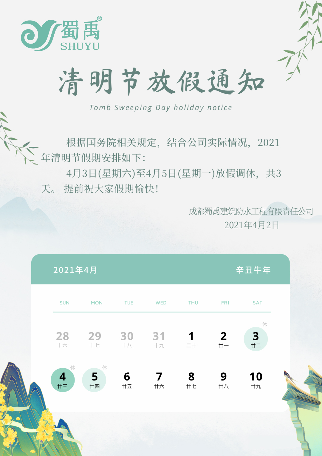 【通知】成都蜀禹建筑防水工程有限責(zé)任公司清明節(jié)放假通知!