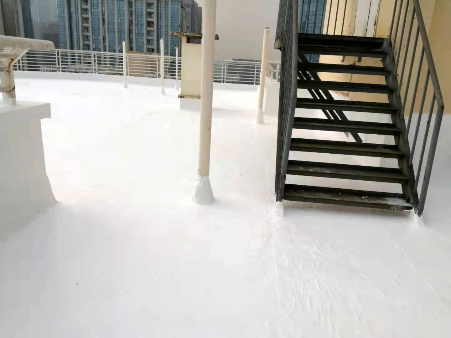 此施工工藝施工后,表面的SYR金屬屋面專用防水涂料配合高分子透明罩面層一起具有防紫外線、抗老化、隔熱降溫等功效,防水層施工后屋面無需再做水泥砂漿保護(hù)層依然可保持屋頂防水層的使用年限,夏季頂樓住戶室內(nèi)降低溫度效果明顯,最高降溫可達(dá)15℃以上。
