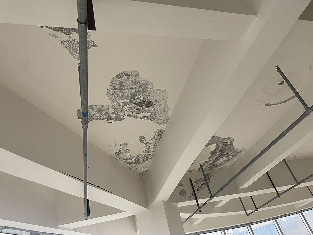 屋頂未施工之前,屋頂表面的保護層已經翻砂起殼,個別地方鋼筋都已經露出