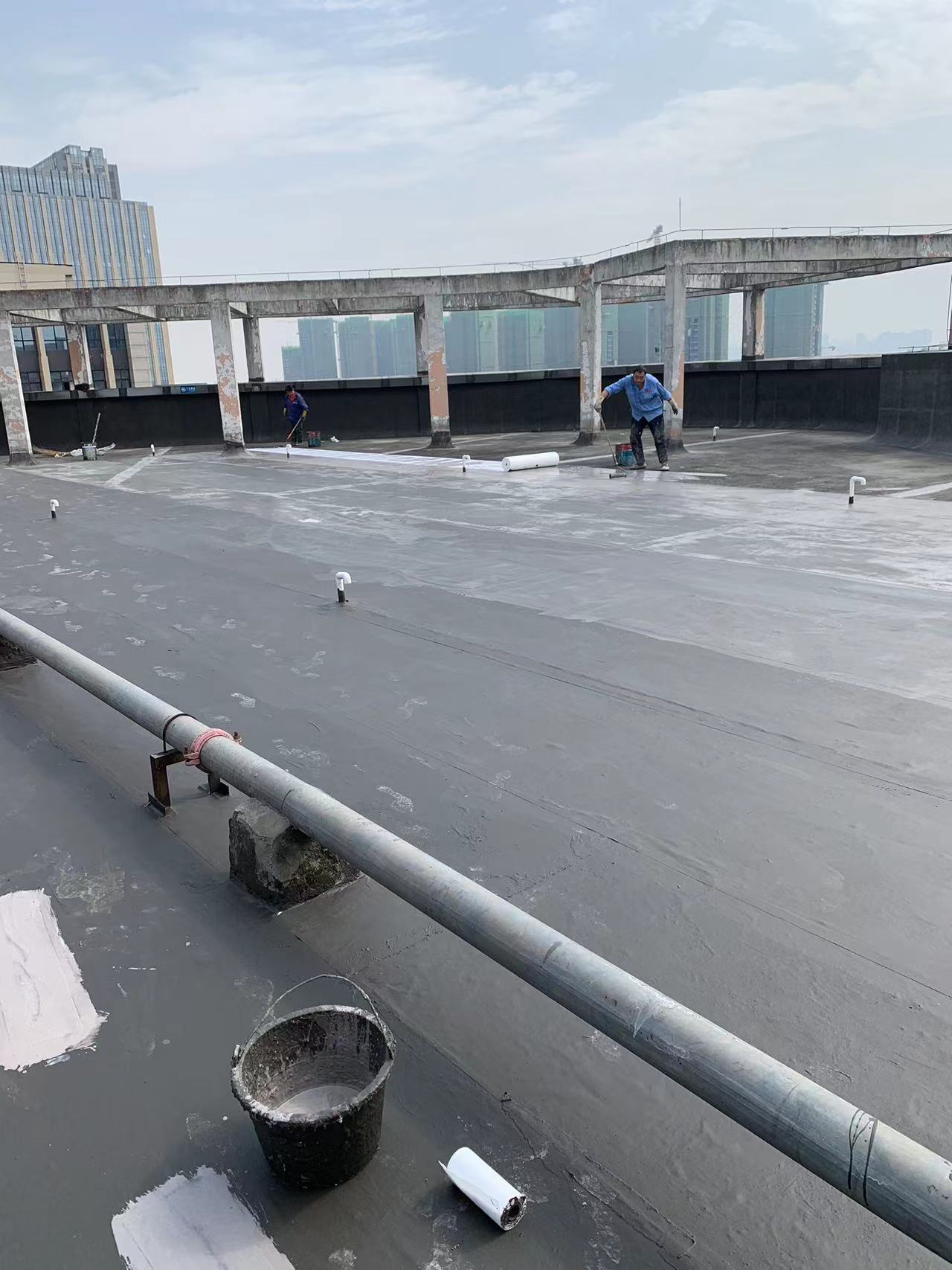 我公司現場施工工藝流程為:先將屋頂基層起殼易脫落的清理掉,破損部位水泥砂漿局部修補,然后基層表面滿涂刷混凝土液體硬化劑進行基層固化處理,這樣處理的好處是,后面做的防水層能夠與基層牢牢的粘結在一起;待混凝土液體硬化劑固化之后,屋頂的地面及墻面全部滿涂刷蜀禹Ⅰ型聚合物水泥防水涂料然后滿鋪貼專用的縫織聚酯布再涂刷蜀禹Ⅰ型聚合物水泥防水涂料,待干后表面涂刷蜀禹Ⅰ型聚合物水泥防水涂料,等待干后表面再涂刷兩道SYR金屬屋面防水涂料涂層。施工完畢之后,等待施工的防水涂層干透之后,屋頂做閉水試驗一星期后不漏水驗收合格之后交驗。