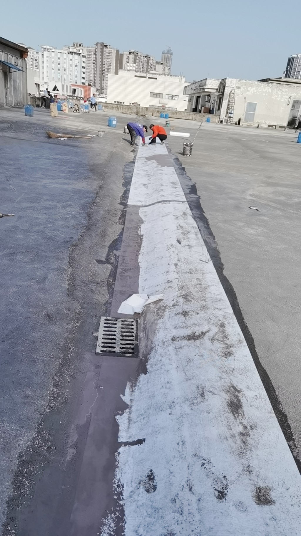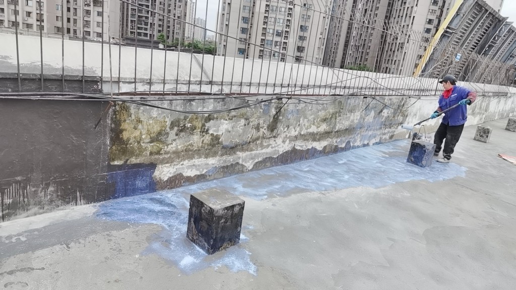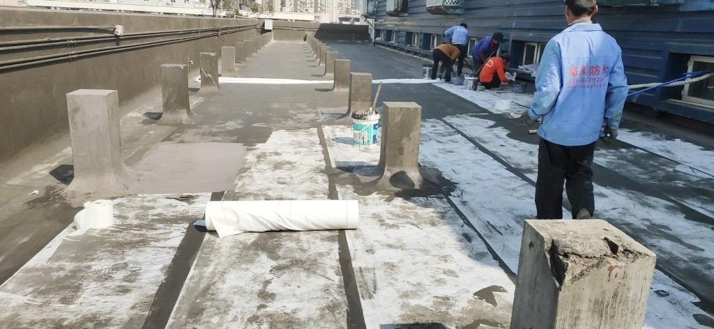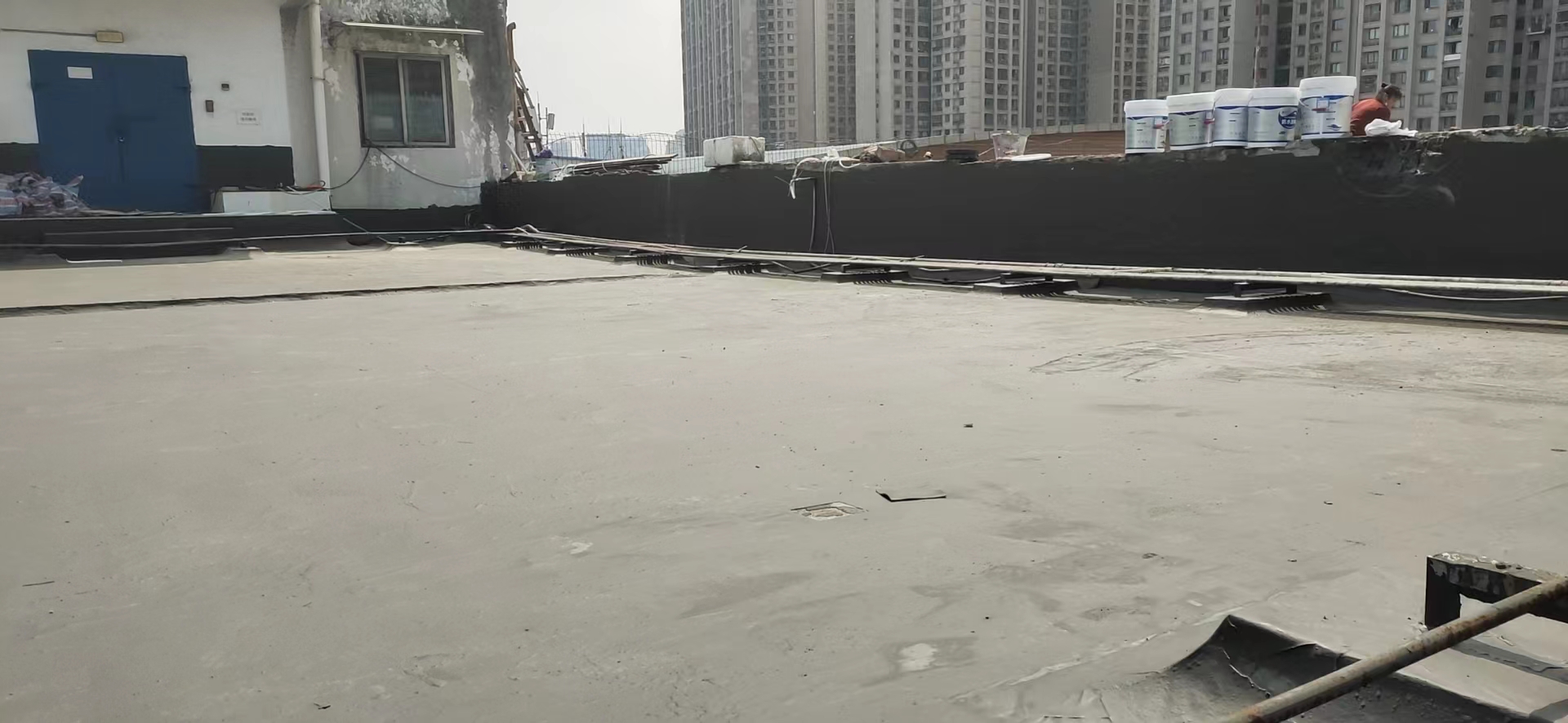 這個工程具有相當大的施工難度,主要是因為屋頂修建了很多花臺,并貼了瓷磚,導致屋頂非常雜亂。為了確保工程的順利進行,在施工前,我們首先將屋頂?shù)幕ㄅ_拆除,地面的瓷磚以及剛性保護層拆除,并將建渣搬運下樓清運出場。待地面平整好后,我們在基層表面滾涂混凝土液體硬化劑,對基面進行固化處理。