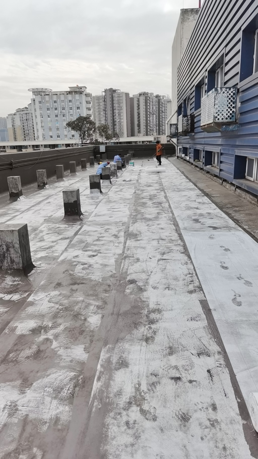 隨后,我們在屋頂表面涂刷蜀禹Ⅰ型聚合物防水涂料,并滿鋪貼專用聚酯布,然后再涂刷Ⅰ型聚合物防水涂料。待涂料干后,我們在表面涂刷兩遍SYR金屬屋面專用防水涂料。