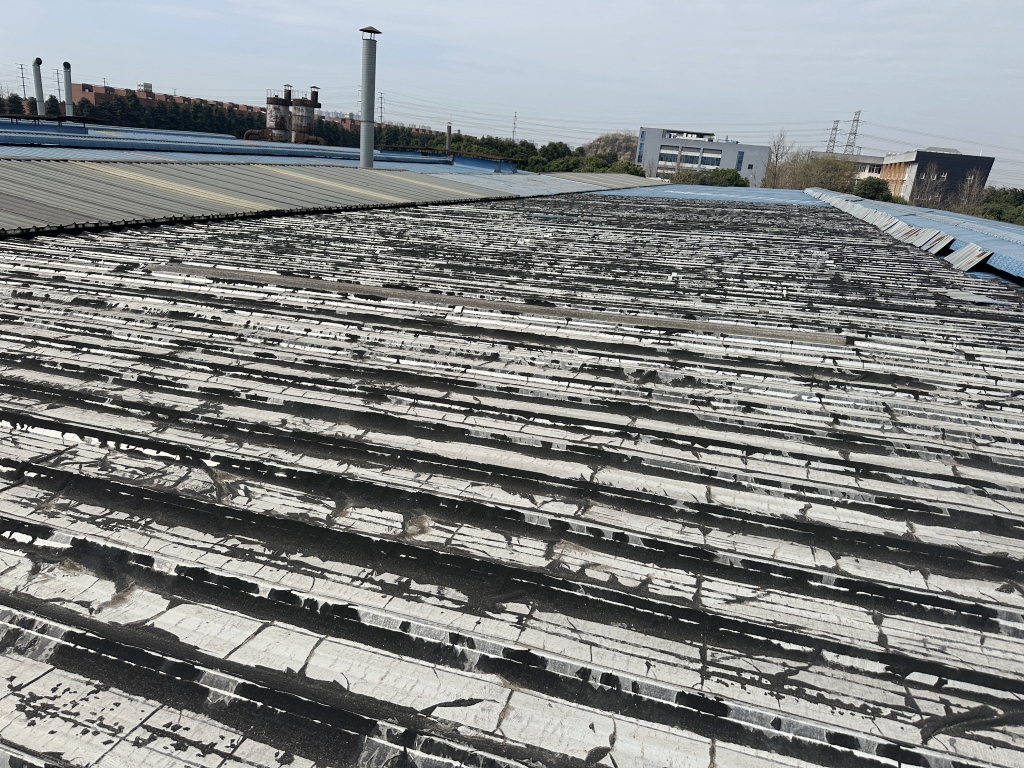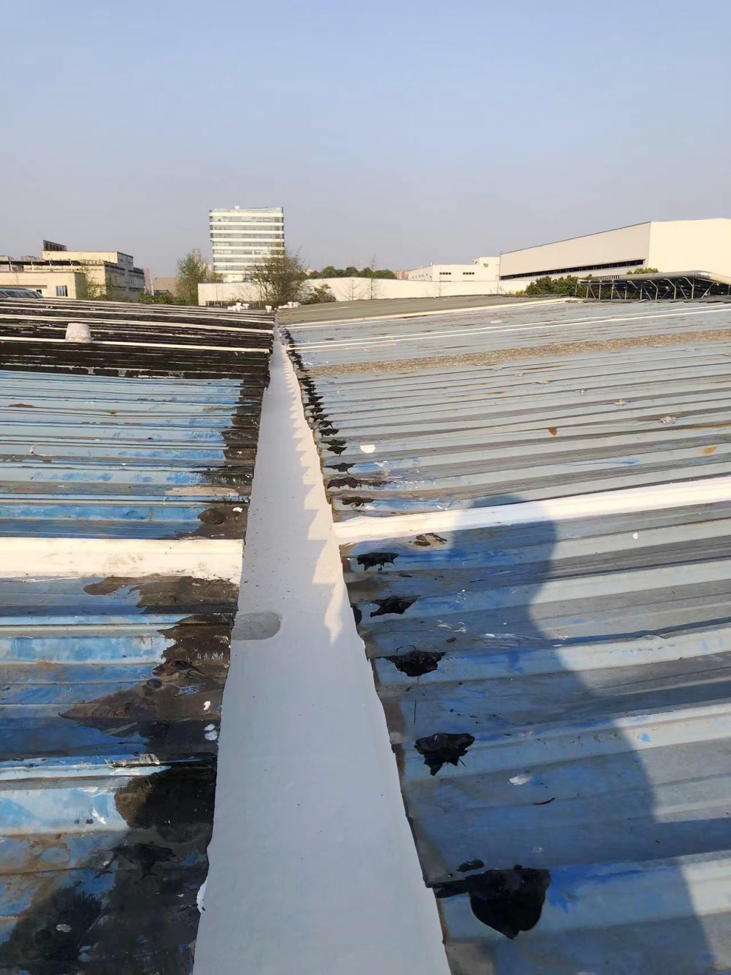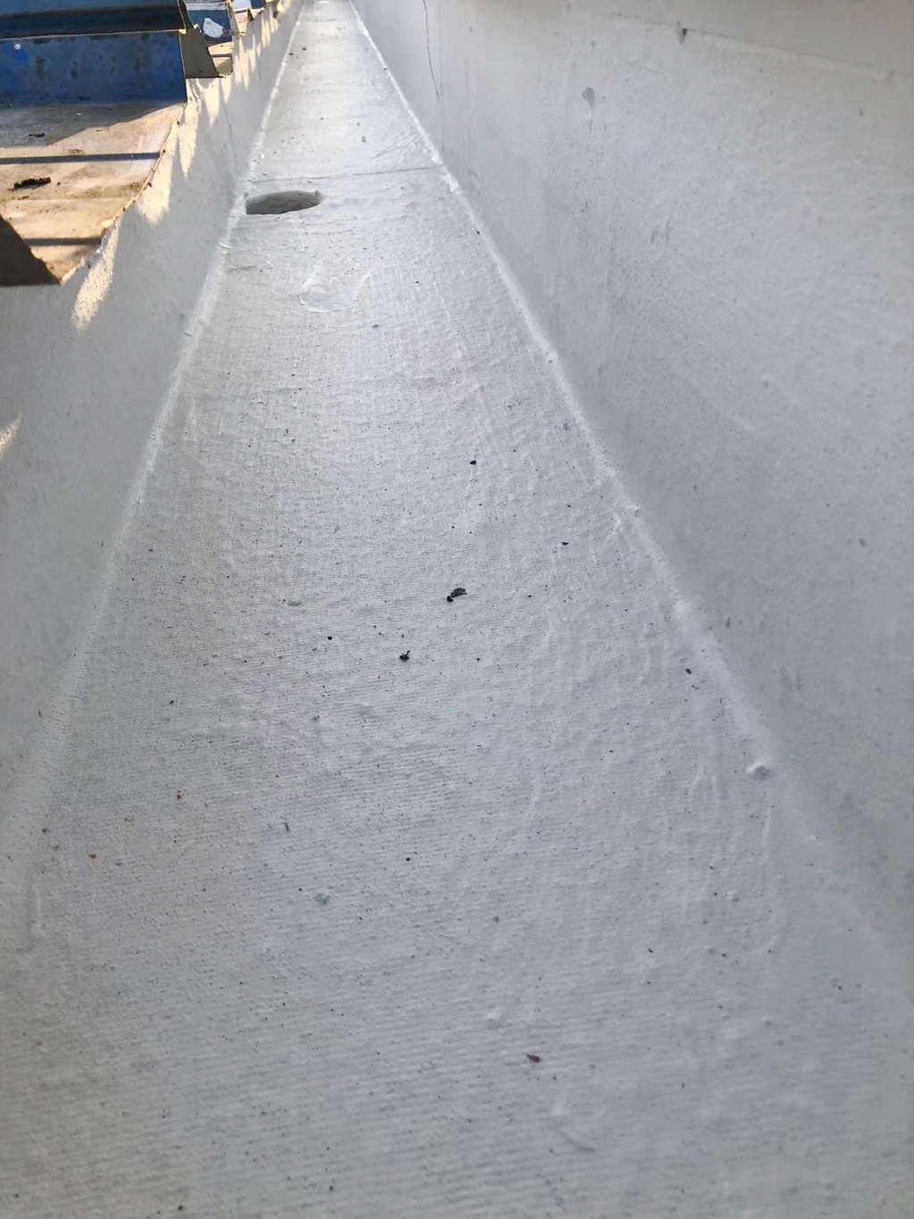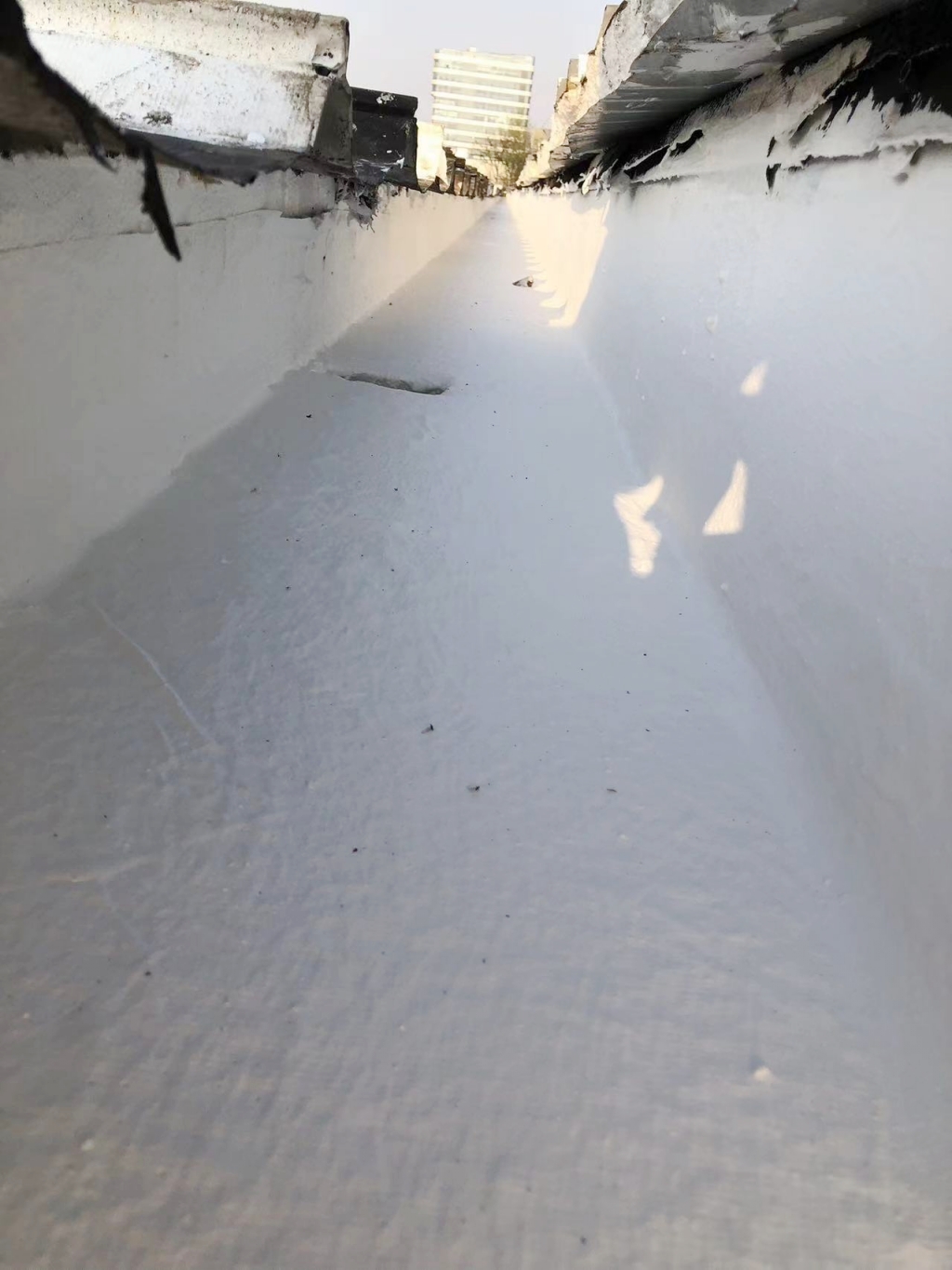 在施工過(guò)程中,公司技術(shù)團(tuán)隊(duì)首先揭掉了天溝內(nèi)的瀝青防水卷材,發(fā)現(xiàn)下方天溝已經(jīng)銹蝕嚴(yán)重,出現(xiàn)了多處穿孔。針對(duì)這一問(wèn)題,團(tuán)隊(duì)先對(duì)天溝進(jìn)行了除銹處理,并涂刷了免除銹納米固銹劑,有效阻止了銹蝕的進(jìn)一步發(fā)展。隨后,團(tuán)隊(duì)在天溝內(nèi)涂刷了SYR金屬屋面專用防水涂料,并鋪貼了專用縫織聚酯布,以增強(qiáng)防水層的韌性和耐久性。最后,再在天溝表面涂刷了兩遍SYR金屬屋面專用防水涂料,確保防水效果達(dá)到**。