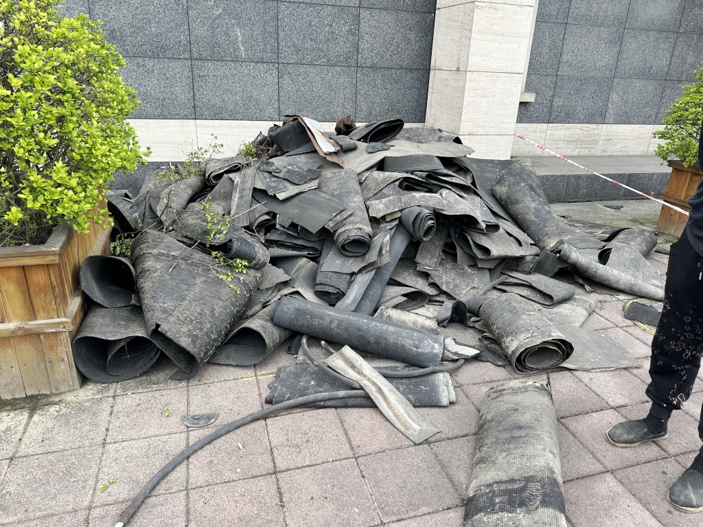 面對這一挑戰,我們采用了先進的SYR外露型無縫防水系統。在項目開始之初,我們注意到原屋頂表面覆蓋的是已經老化開裂的改性瀝青防水卷材。為了確保防水效果的長久性和可靠性,我們決定先將這些老舊的防水卷材徹底清除,并對基層表面進行細致清理,確保每一寸都干凈整潔,為后續的防水工作打下堅實基礎。
