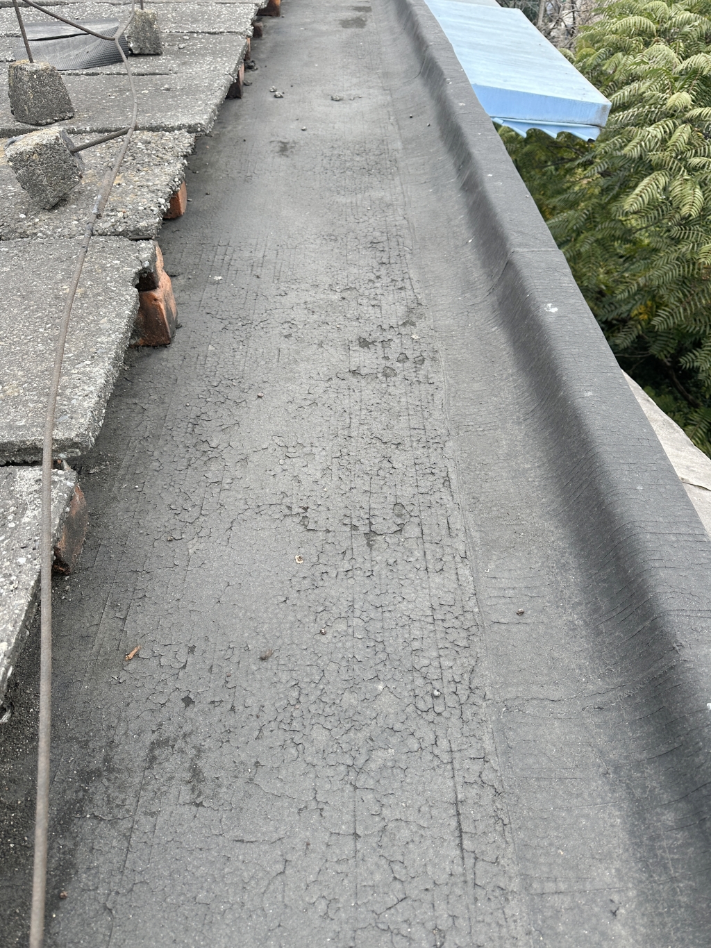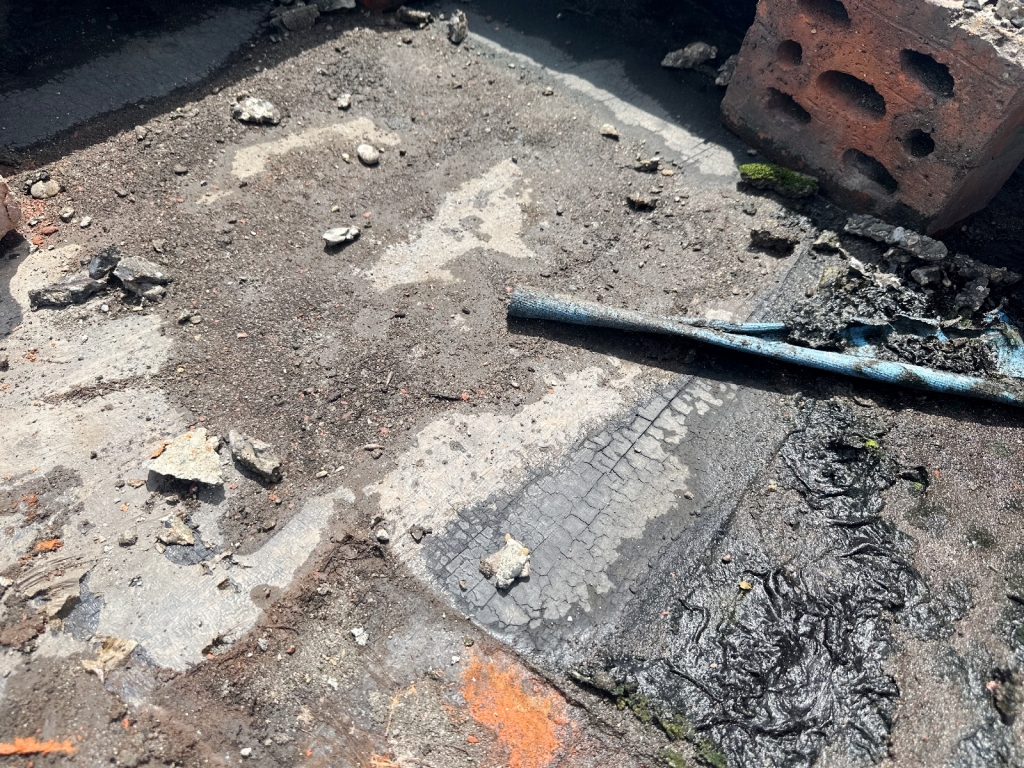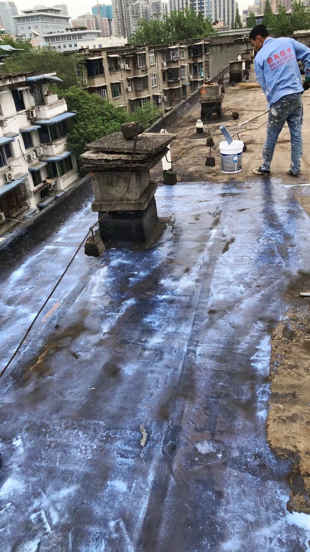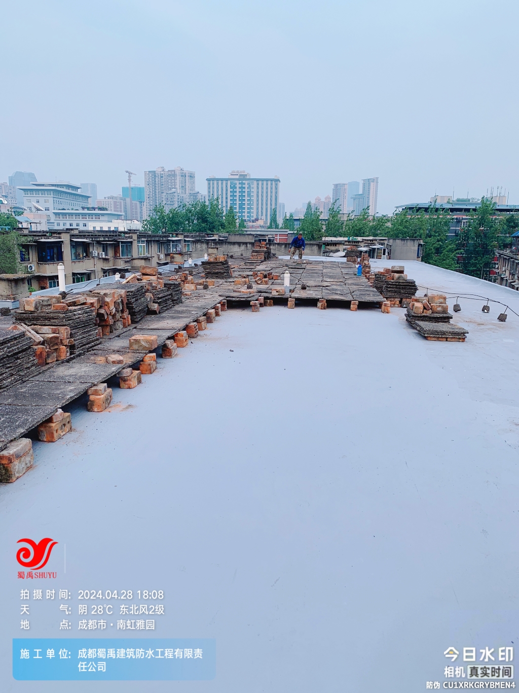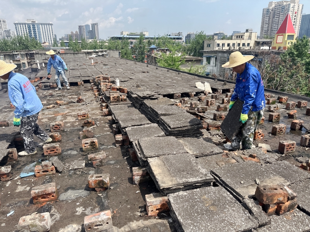 項目初期,蜀禹防水團隊首先對屋頂進行了全面的勘查與評估,隨后,施工隊伍小心翼翼地將屋頂表面的隔熱板逐一揭開,并將下方的磚塊逐一搬開,確保施工區域完全暴露且基層干凈無雜物。這一步驟雖然繁瑣,但為后續的防水處理奠定了堅實的基礎。