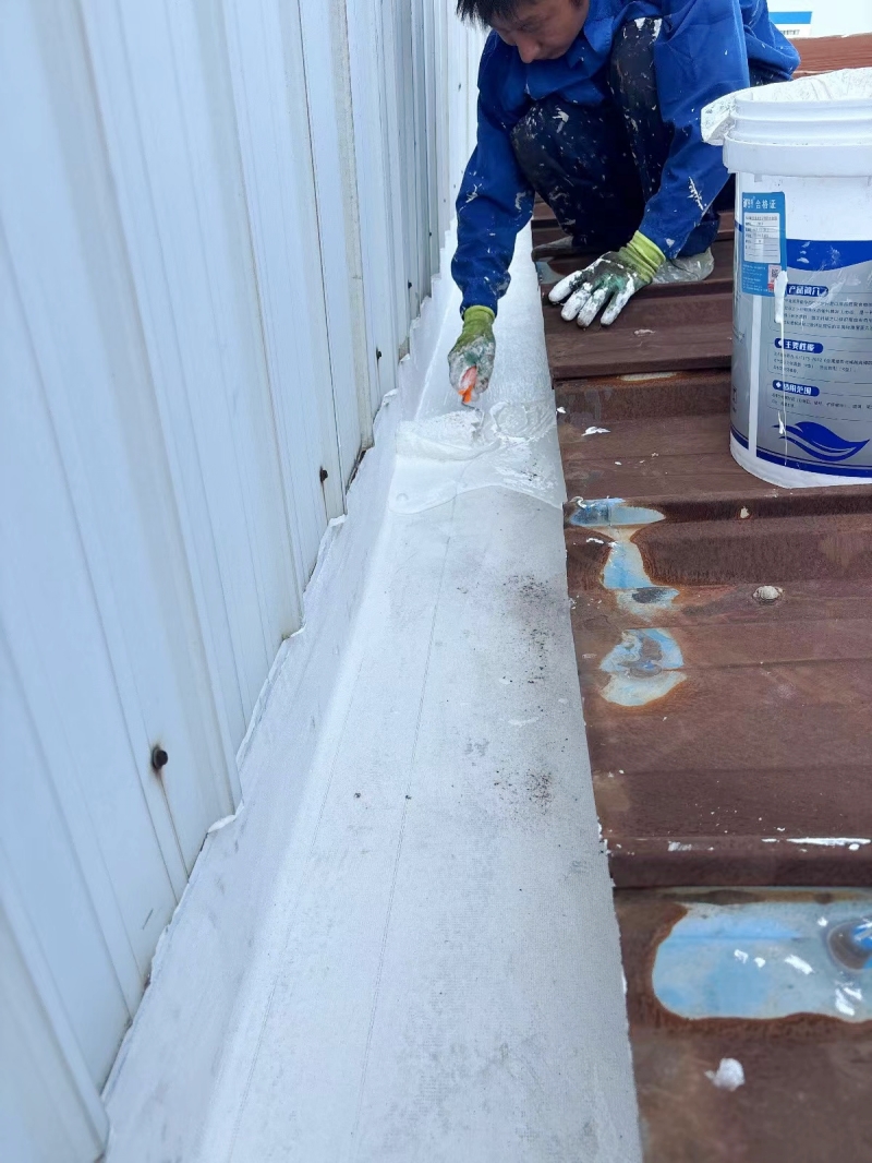 細節(jié)防水處理:針對彩鋼頂表面的彩鋼瓦搭接縫及固定螺釘部位,涂刷15cm寬的SYR金屬屋面專用防水涂料,并鋪貼防水專用縫織聚酯布,確保這些易滲水部位的防水效果。