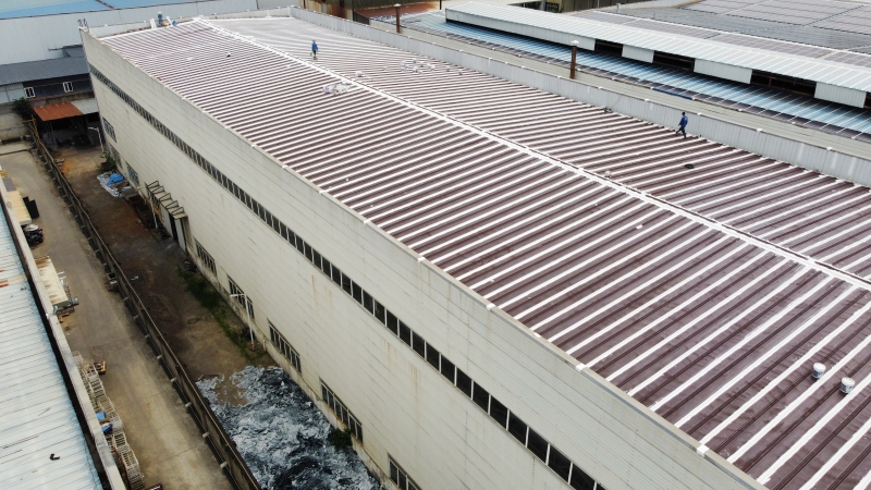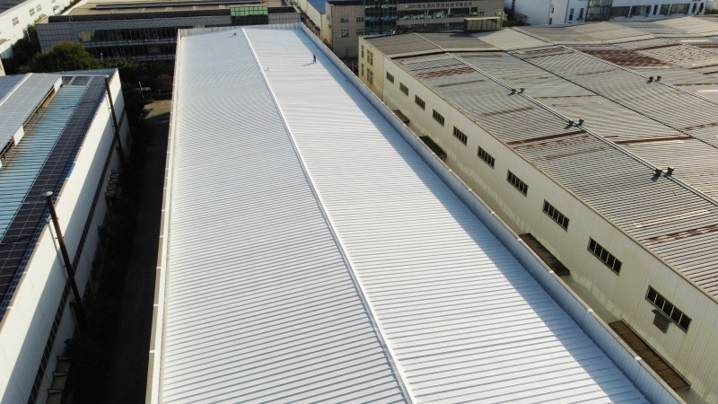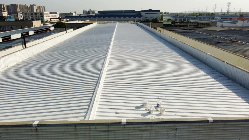 全面防水防腐翻新:整個彩鋼頂屋面滿涂SYR金屬屋面專用防水涂料進行防腐翻新,待干后再涂第二遍,形成雙重防護層,延長了彩鋼頂?shù)氖褂脡勖?/p>