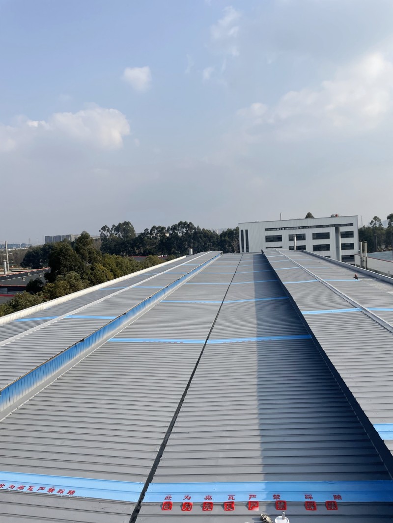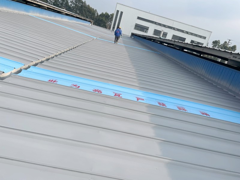 整體防腐翻新:為了全面提升屋面的防腐性能,對整個廠房彩鋼頂屋面滿涂一遍 SYR 金屬屋面專用防水涂料進行防腐翻新。待干燥后,再涂第二遍該防水涂料,形成更厚、更堅韌的防腐防水層。值得注意的是,采光瓦表面噴涂的涂料調色與彩鋼瓦表面顏色不同,這樣便于施工后分辨屋頂采光瓦的位置,避免后續維護中出現誤操作。