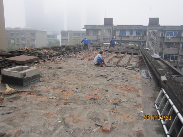 中節能建設工程設計院有限公司在成都市經華北路一號院和經華北路10號的宿舍小區老舊房屋由于年代久遠,房屋多處漏水,公司針對小區所有屋頂進行了一次全部的防水施工,將屋頂有隔熱板的區域屋頂,隔熱板揭開,基層清理干凈,滿鋪一層改性瀝青防水卷材,再做一層水泥砂漿保護層,最后再蓋回隔熱板。1號樓屋頂無隔熱板的,在屋頂表面鋪一層改性瀝青防水卷材。